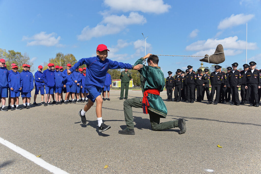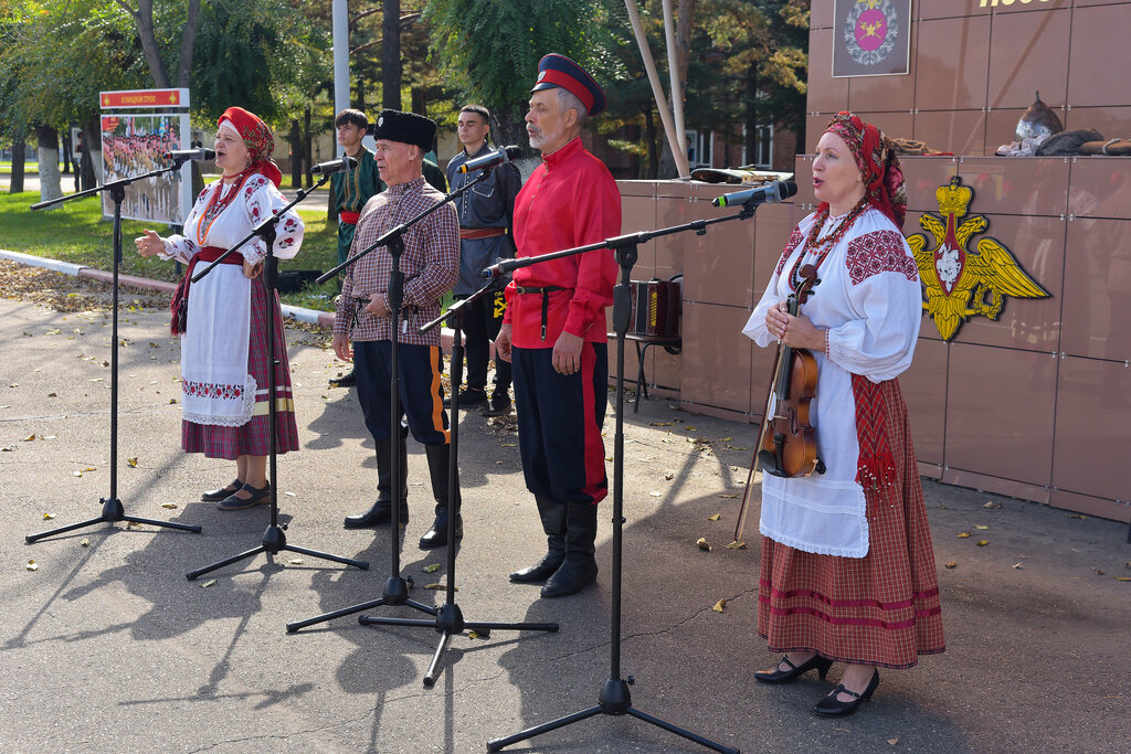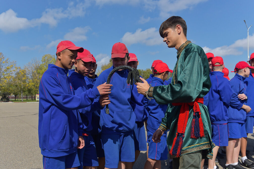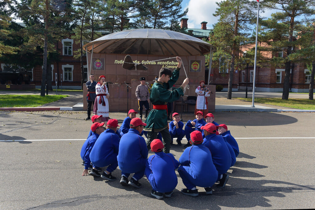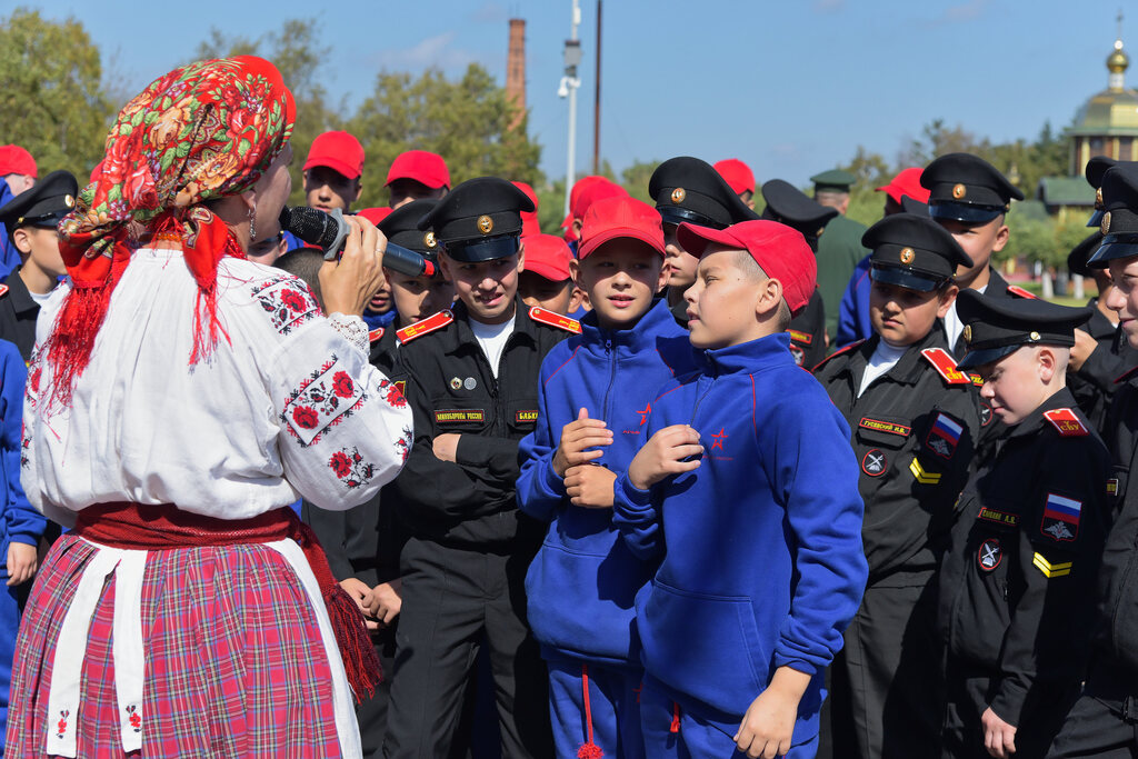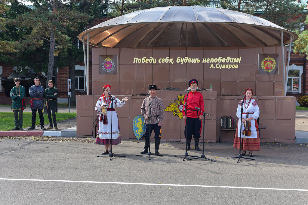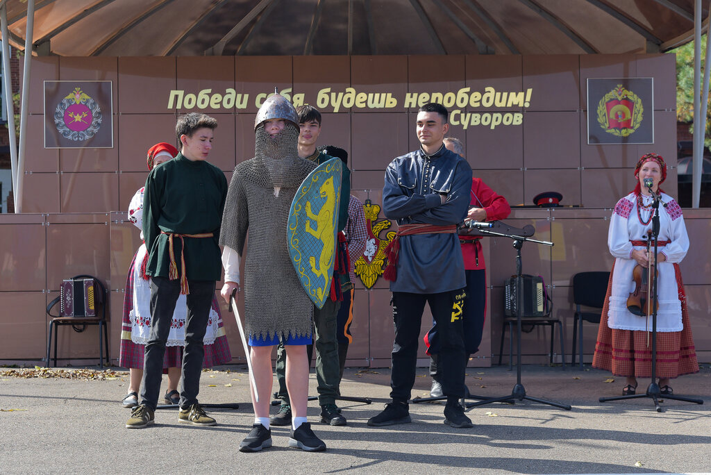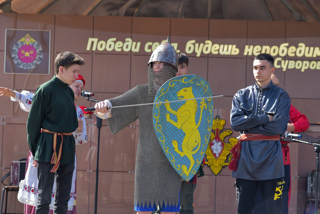 В исполнении ансамбля народной музыки «Традиция прозвучали песни о Великой Отечественной войне «Зима лютая проходит» и «Ой да вспомним, братцы, мы, кубанцы». Дети услышали старинную казачью былину о богатыре Илье Муромце, исполненную Заслуженным работником культуры Олегом Семеновым. В это время одного из суворовцев облачили в богатырский доспех: кольчугу, шлем, вручили щит, чтобы он показал свою силу богатырскую.