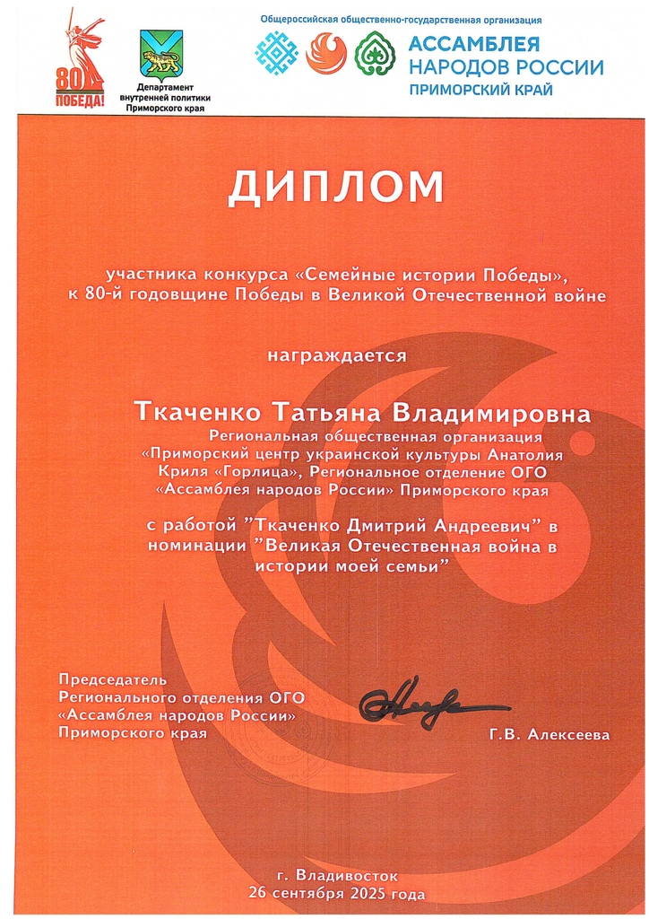 Более тридцати лет принимает активное участие в общественной жизни Приморского края Татьяна Владимировна Ткаченко. В 1992 году она пришла в общество украинской культуры во Владивостоке как участница украинского хора, затем ведущая, автор сценариев фестивалей и концертов.