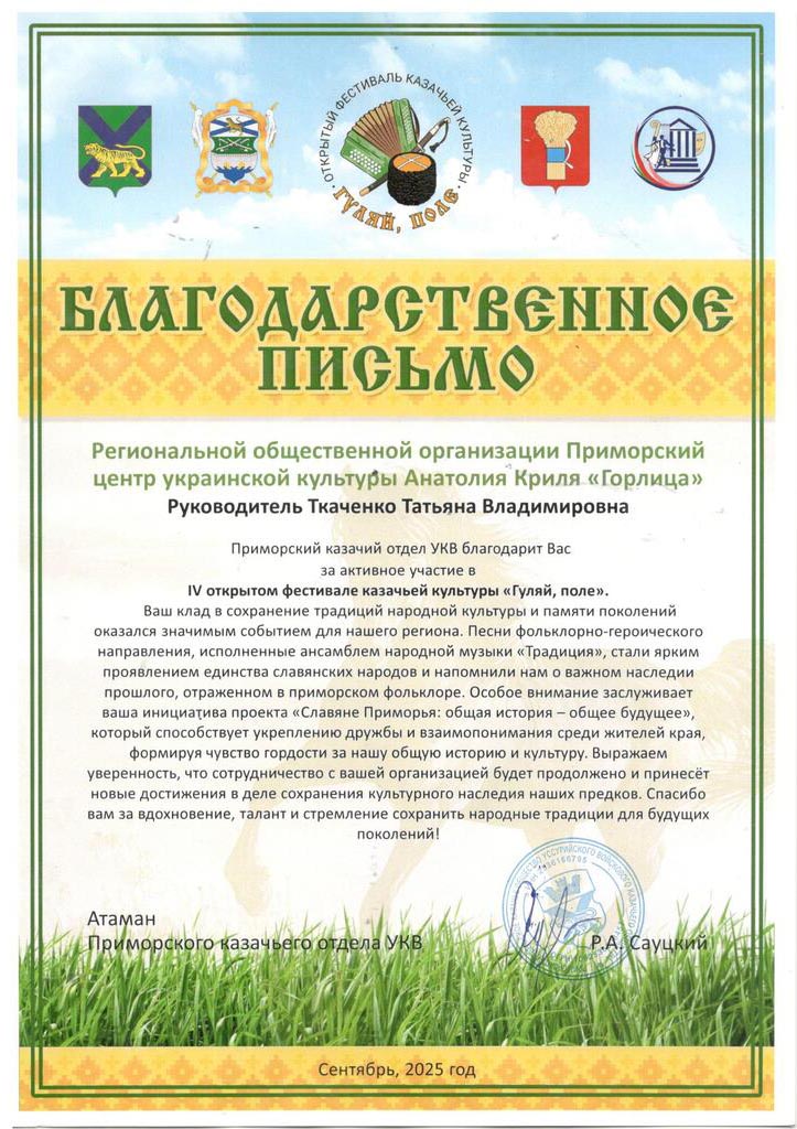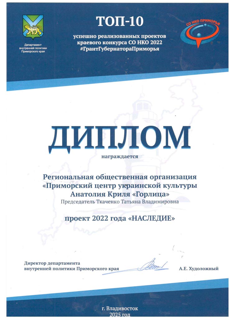 Ежегодно, начиная с 2015 года команда под руководством Т. В. Ткаченко получает грантовую поддержку и успешно реализует общественно значимые проекты, которые ставят главной целью сохранение и популяризацию этнокультурного наследия приморских славян, трансляцию его в молодёжную среду. За это время реализовано двенадцать проектов, которые получили положительный общественный резонанс, поддержку жителей и гостей края. Дважды проекты становились победителями конкурса Президентских грантов. По рекомендации Фонда резидентских грантов РОО «Приморский центр украинской культуры Анатолия Криля «Горлица» получил статус организации, поставляющей социальные услуги.
